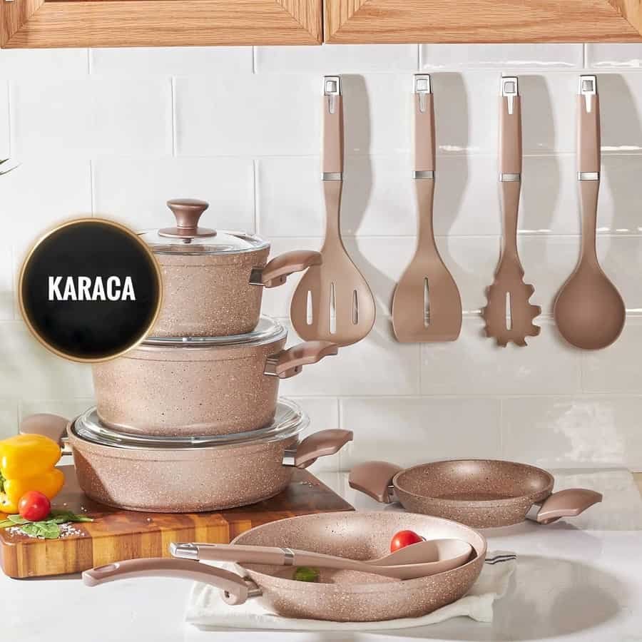 - Το σετ μαγειρικών σκευών Karaca Biogranit 13 τεμαχίων είναι ένα από τα πιο δημοφιλή προϊόντα μεταξύ των σετ μαγειρικών σκευών από γρανίτη με βάση την επαγωγή.