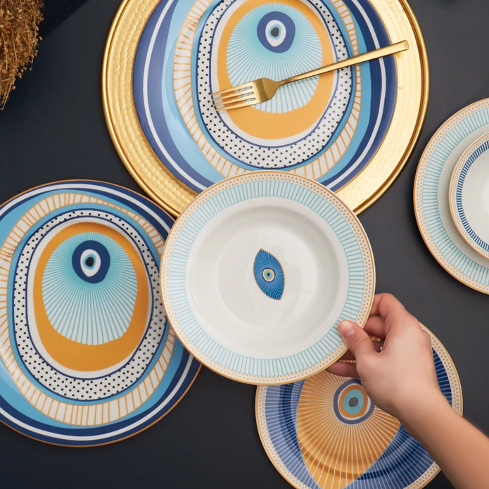 Λαμπερά τραπέζια… Το σετ φαγητού Karaca Blue Eye 6 ατόμων συνοδεύει τις παρουσιάσεις σας με τον ξεχωριστό σχεδιασμό του, τόσο στα επίσημα όσο και στα καθημερινά τραπέζια. Περιλαμβάνει 6 πιάτα σερβιρίσματος, πιάτα κέικ, πιάτα δείπνου και μπολ.