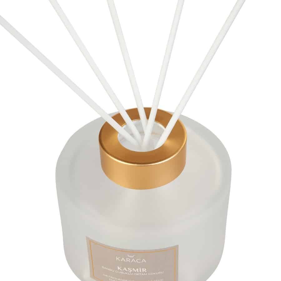 Το άρωμα των λουλουδιών περγαμόντο, το οποίο φημίζεται για το μοναδικό και κυρίαρχο άρωμά του, σταματά στους κήπους των πορτοκαλιών και κάνει ένα διάλειμμα στα δέντρα Mandarin. Άχυρο Kaaba που εξαφανίζεται στα μυστηριώδη βάθη των φύλλων καπνού, λουλούδια γεράνι που υπόσχονται ειρήνη με τις έντονες αποχρώσεις τους και τη δροσερή μυρωδιά του χώματος που έρχεται μετά τη βροχή. Ενώ τα λάχανα που συμβολίζουν την ειρήνη ανθίζουν στα πεδία της λεβάντας, η γαλήνια ενέργεια που δημιουργείται από τις αρωματικές νότες του φασκόμηλου εγκαθίσταται στις νότες της καρδιάς. Η παρήγορη ανατολίτικη φύση της βανίλιας συνδυάζεται με τη ζεστασιά και την τραγανότητα του σπόρου Τόνκα, σε συνδυασμό με τη μοναδική μυστικιστική φύση των λουλουδιών πατσουλί. Κλείνοντας το μάτι με τη μυρωδιά του, το Labdanum επιτυγχάνει μια υπέροχη ισορροπία στην ξηρή και γήινη αντανάκλαση του Vetiver και η επική διάδοση του αρώματος σημειώνεται από τις χαλαρωτικές μελωδίες του ξύλου Κέδρου. - Karaca Cashmere Stick Room και άρωμα περιβάλλοντος