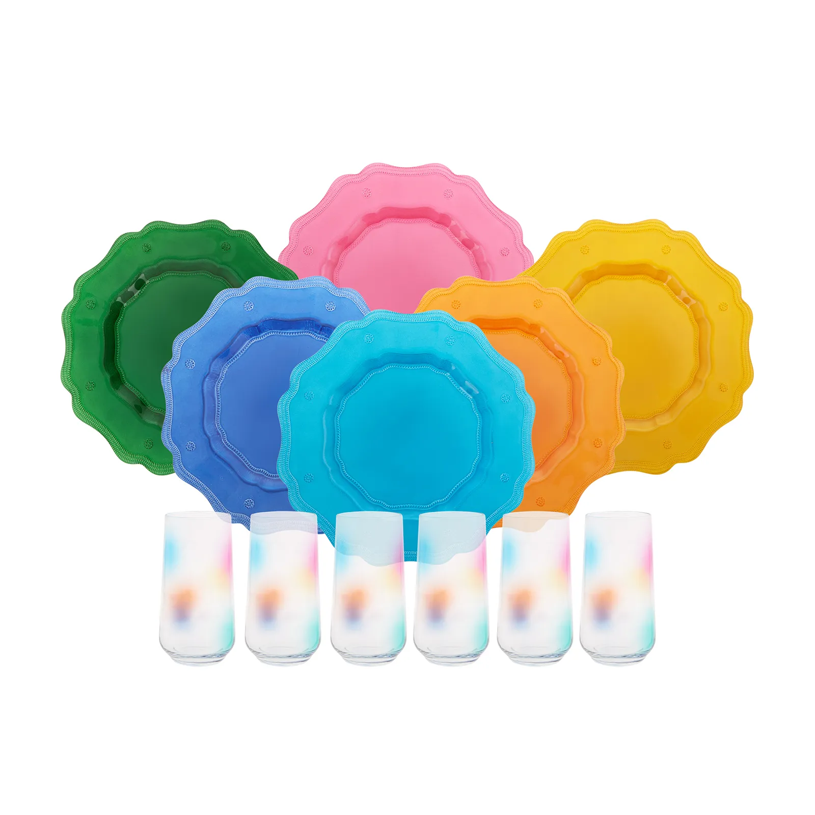 Υπέροχα χρώματα που φέρνουν το μποέμ πνεύμα στα τραπέζια, δυναμικό σχέδιο και ρετρό αποτέλεσμα. Το σετ κέικ φαγητού Karaca Fun αποτελείται από 6 πιάτα σερβιρίσματος, 6 πιάτα κέικ και 6 ποτήρια. Αυτό το πολύχρωμο σετ σερβίτσιων 18 τεμαχίων είναι ιδανικό για όσους θέλουν να στήσουν δυναμικά τραπέζια. Αυτό το σετ κέικ και ποτηριών, που μπορείτε να επιλέξετε για καθημερινή χρήση, θα γεμίσει ενέργεια και χαρά το τραπέζι και την κουζίνα σας με το διασκεδαστικό σχέδιο και τα χρώματά του!