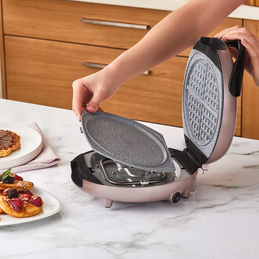 - Πλάκες επικάλυψης που μοιάζουν με γρανίτη που κατανέμουν τη θερμότητα ομοιόμορφα παντού, η βάφλα δεν μένει ωμή, εμφανίζεται το ίδιο χρώμα επειδή το πάνω και το κάτω μέρος ψήνονται εξίσου.