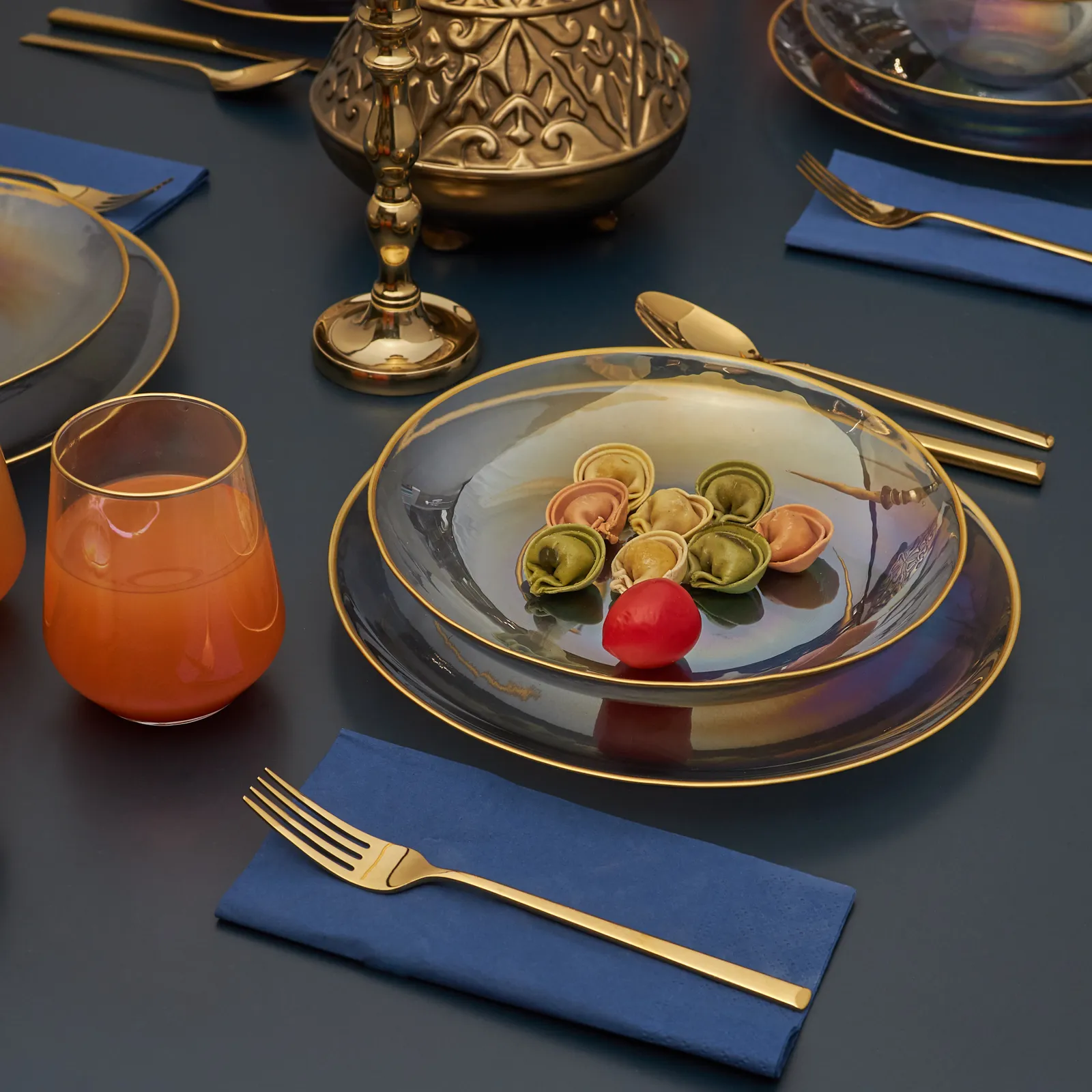Το φανταχτερό σετ φαγητού και ποτηριού Karaca 24 τεμαχίων για 6 άτομα προσθέτει μια μοναδική κομψότητα στο τραπέζι σας με το χρώμα του ολογράμματος και τις χρυσές λάμψεις που περιβάλλουν τη μορφή του. Μπορείτε να το χρησιμοποιήσετε στις ειδικές προσκλήσεις και στα καθημερινά σας τραπέζια. Το γυάλινο σετ δείπνου για 6 άτομα περιλαμβάνει ένα πιάτο σερβιρίσματος, βαθύ πιάτο και μπολ, καθώς και σετ ποτήρια που συμπληρώνουν το τραπέζι σας. Με αυτόν τον τρόπο, μπορείτε να προετοιμάσετε μια πλήρη παρουσίαση στο τραπέζι σας,για την οικογένειά σας ή τους φίλους σας.